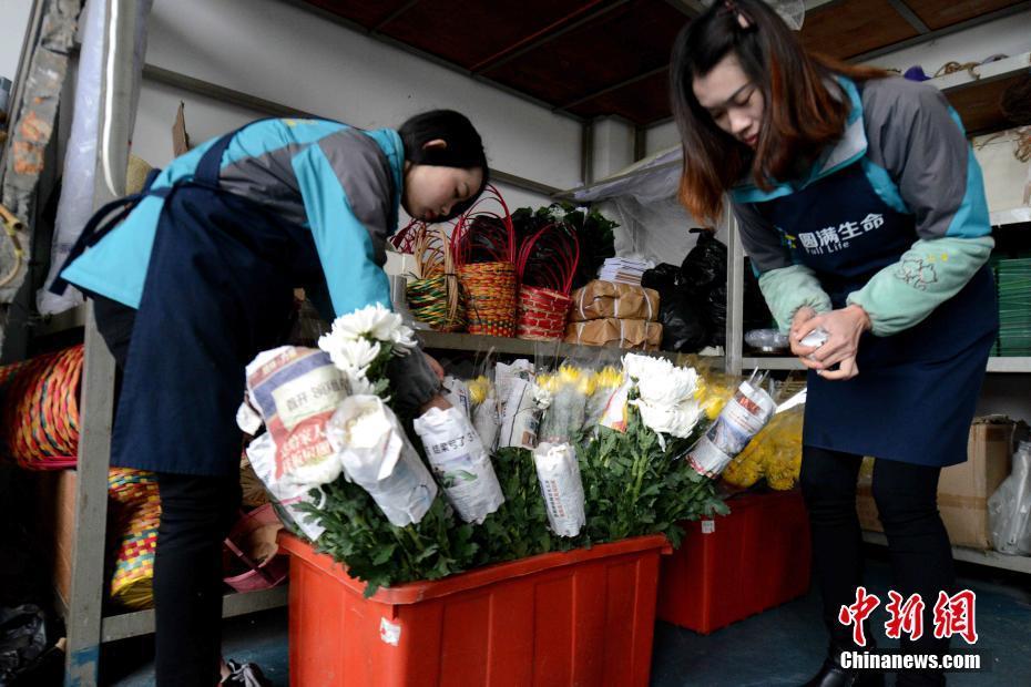 小王和小许正在准备花朵,准备去布置灵堂。王东明 摄