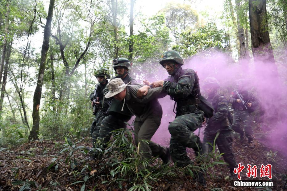 训练模拟2名毒贩逃往山林后,特战官兵克服山高、林密、坡陡等不利因素,密切协同、快速搜索,并运用无人机侦察、伪装侦察、抵进侦察等方式,发现犯罪分子的藏匿地点,快速成功将2名犯罪分子抓获。图为特战队员成功抓捕犯罪分子。 任金鹏 摄