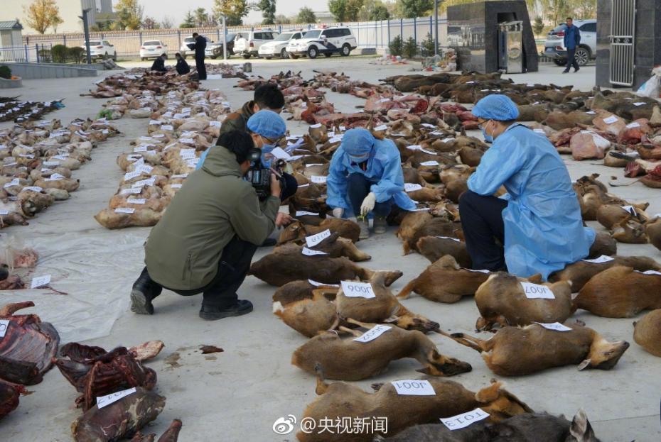据央视新闻3月22日报道,甘肃、陕西公安近日破获一起非法猎捕、贩卖野生动物案,查获果子狸、野猪、赤麂等14种1025只,其中濒危野生动物鬣(li?)羚、斑羚共5只。不法分子偷猎野生动物后,冷库藏尸,定期向四川等地贩卖。图为野生动物尸体。 央视记者 张鹏军 摄 图片来源:央视新闻