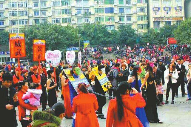 两男子戴枷锁被美女牵着游街 医院称是行为艺术
