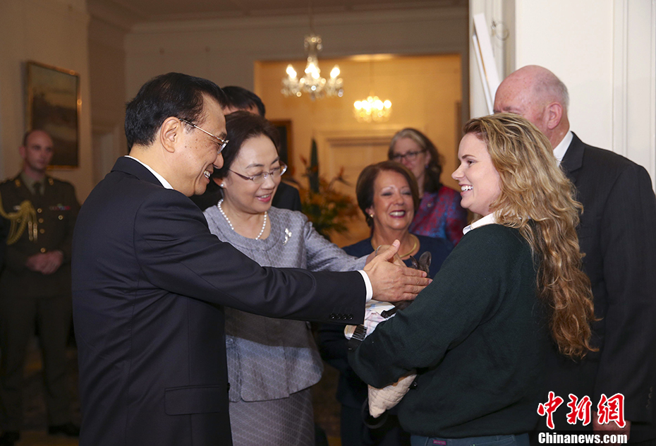当地时间3月23日下午,中国国务院总理李克强在堪培拉总督府会见澳大利亚总督科斯格罗夫。李克强总理夫人程虹和科斯格罗夫总督夫人林恩·科斯格罗夫参加会见。为表示友好,科斯格罗夫特意向李克强夫妇展示了一只7个月大的小袋鼠。 中新社记者 刘震 摄