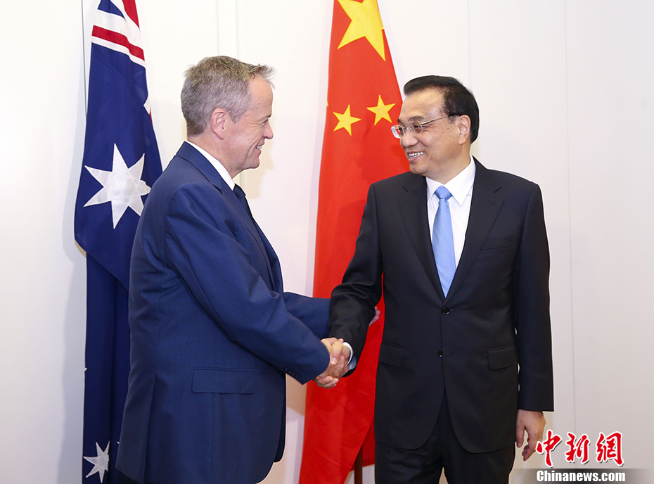 当地时间3月23日下午,中国国务院总理李克强在堪培拉议会大厦会见澳大利亚工党领袖肖顿。 中新社记者 刘震 摄