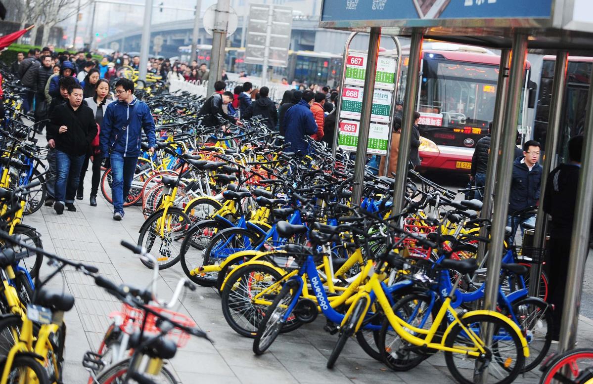 八王坟东公交车站长期以来一直是CBD前往北京东部地区以及燕郊、大厂的客流集散地。22日晚高峰后,长达百米的公交站区域,被多个“单车群”占据。图片来源:视觉中国