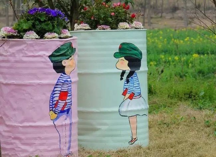 村里的兄弟姐妹们以村里生产遗弃的油桶为材料打造主干道风景,他们中的主力成员是位画家同时又是村里宣传文化员,大家在他的指导下创意无限。