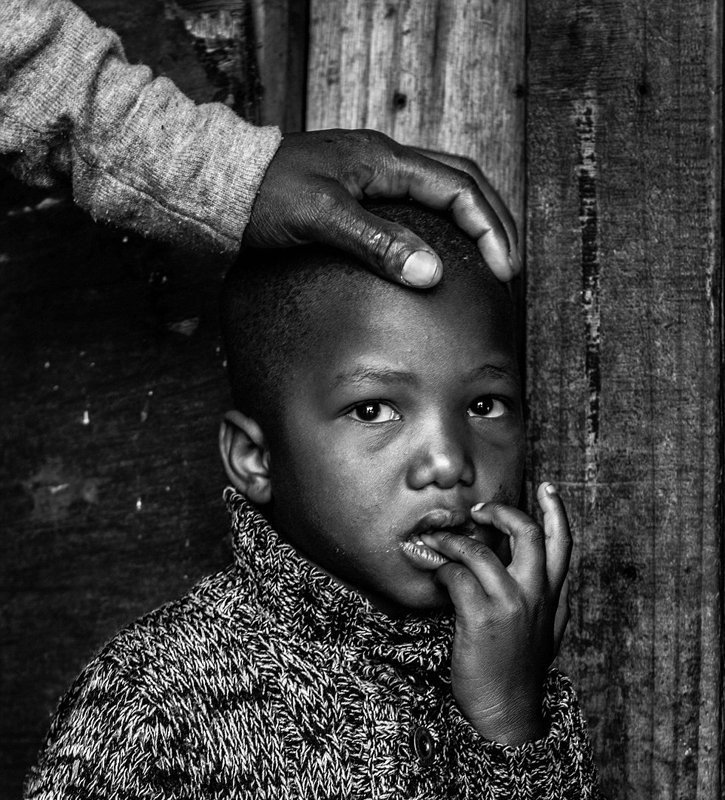 在南非开普敦,一位父亲将手放在孩子的头上,在结束种族隔离之前,这些定居点只给非白人居住。