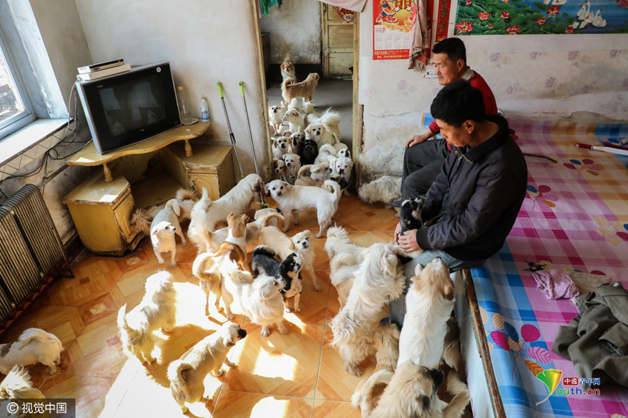 2017年03月22日,辽宁省丹东市,“我差不多跟流浪狗同吃同住了17年”,刘振洪说,流浪狗越收越多,把人住的东屋都给占了。“原来我们夫妻俩都睡东屋这铺炕,但是晚间我得经常起来给狗劝架,否则会出现咬死咬伤的情况。为了我老婆能睡安稳觉,只好分炕,她睡西屋炕。”