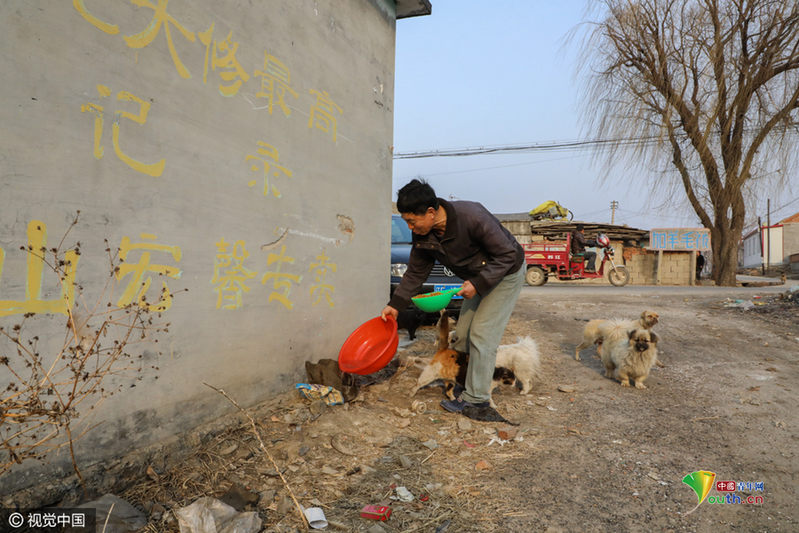 每一天,忙完了给将近400只流浪狗喂食,刘振洪还要走出家门,沿着150多米长的村路,给流浪在外的野猫野狗喂食。
