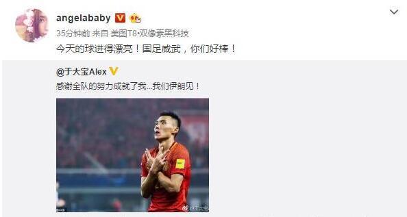 此前于大宝曾做客某足球节目表示过自己最喜欢的艺人就是Angelababy(杨颖)。