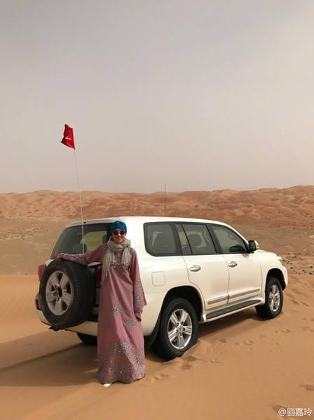 刘嘉玲为了入乡随俗,穿着厚厚的阿拉伯传统服饰,偷戴藏青色头巾,完全认不出往日那个美艳性感的形象。