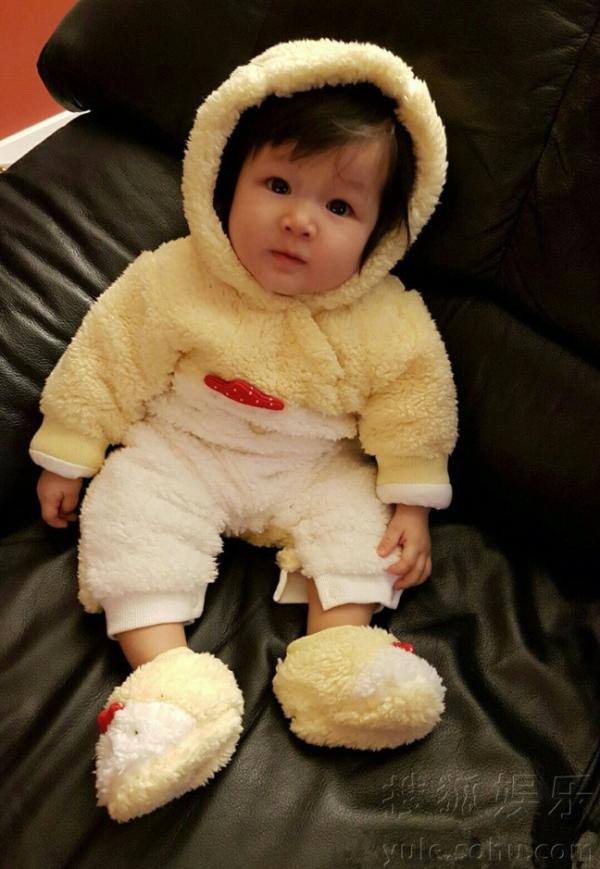 女儿十分可爱,呆萌的表情像玩具娃娃。
