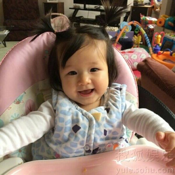 女儿乖巧地坐在推车上,五官都像极了妈妈,非常灵动。