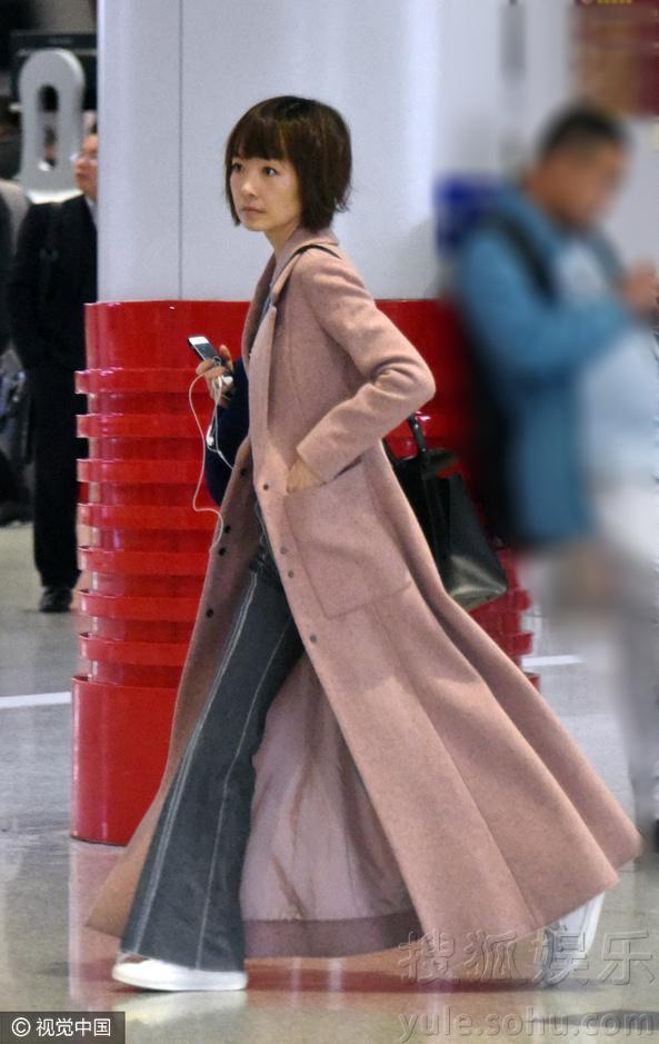 陈鲁豫穿喇叭裤配长风衣,有些显矮。