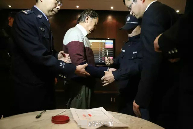 1959年出生的杨幸福曾经担任南通地税局原党组副书记、副局长,并于2015年4月退休。南通检察机关在查办其他职务犯罪时发现,2010年以来,杨幸福涉嫌利用职务便利,在承接工程、办理税务迁移手续、为企业融资等方面为他人谋取利益,收受巨额钱物。报经省检察院同意,南通市人民检察院于2017年1月19日对犯罪嫌疑人杨幸福以涉嫌受贿罪立案侦查,同日决定对其采取刑事拘留强制措施。图为杨幸福被戴上手铐。