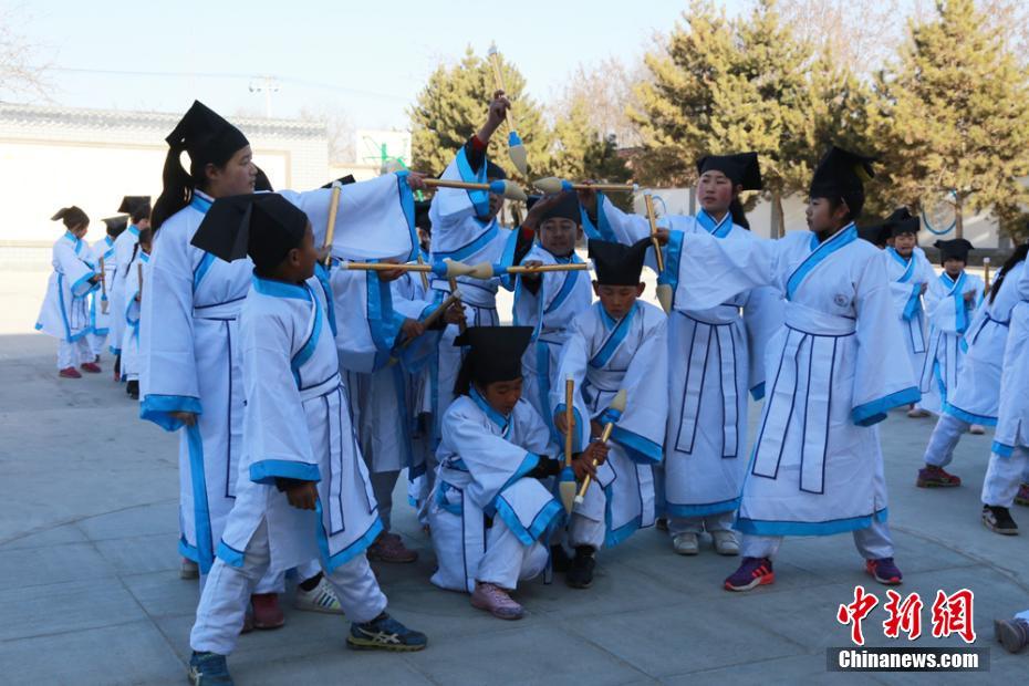 甘肃乡村小学生穿汉服练“书法操”