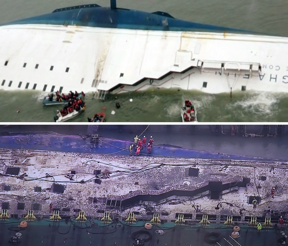 2014年4月16日,震惊世界的“世越号”沉船惨案发生。载有476人的“世越号”客轮在全罗南道珍岛附近海域意外进水并沉没,导致295人遇难,9人下落不明。图为打捞现场。