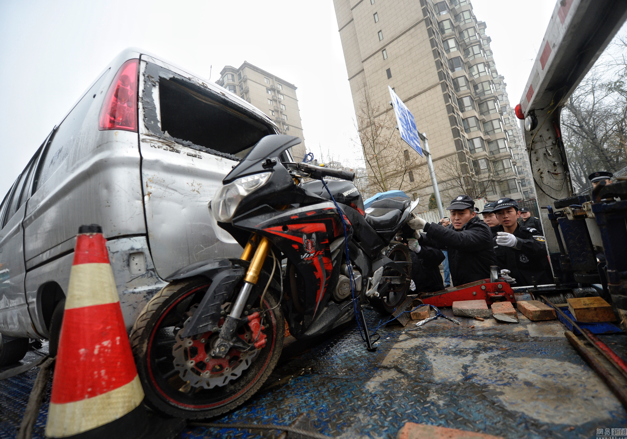 24日下午,执法人员分两组,在公共道路上的僵尸车由城管配合公安、交管部门依法进行清拖处理,小区里的由街道和社区居民通过共商共治拿出解决办法,由城管配合辖区综治、公安、消防等进行处理。当天出动拖车3辆,清理僵尸车7辆,消除了社区居民的心头隐患。2017年3月24日,北京,“僵尸车”集中清理现场。图片来源:视觉中国
