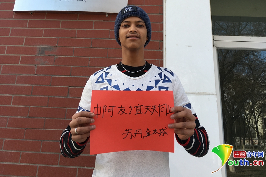 “中阿友谊天天向上”。金太成来自苏丹,也是宁夏大学国际教育学院的留学生,目前学的是中文专业。金太成来中国1年了,他印象最深的就是刚来的时候老师告诉他“好好学习天天向上”,而今天,他期盼着中阿友谊能天天向上,有更长远的发展。谈及未来,他希望能留在中国工作,“因为我爱中国呀!”他说。