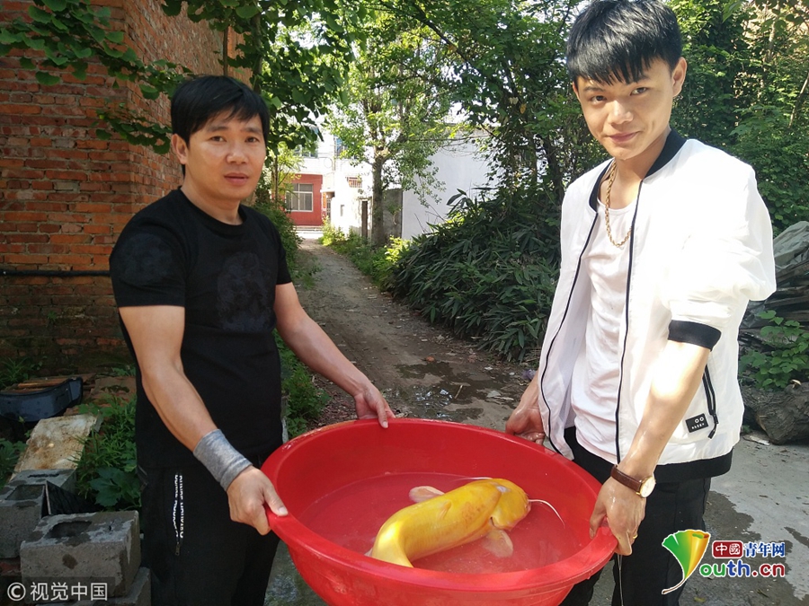 江西瑞昌市民钓到罕见金黄色大口鲇鱼 通体剔透