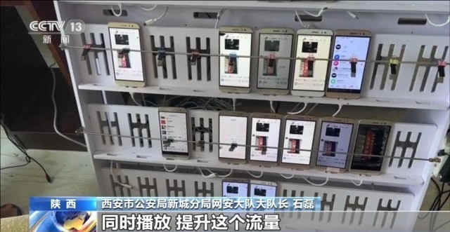 西安市公安局新城分局网安大队的大队长 石磊:我们发现他们(在房子里)都是用手机制作的一个手机支架,甚至手机墙,同时播放(视频)提升视频的流量。而且那个手机支架上,会有一个小杆,小杆不停地进行触屏处理,防止后台的监测到它机刷的嫌疑。