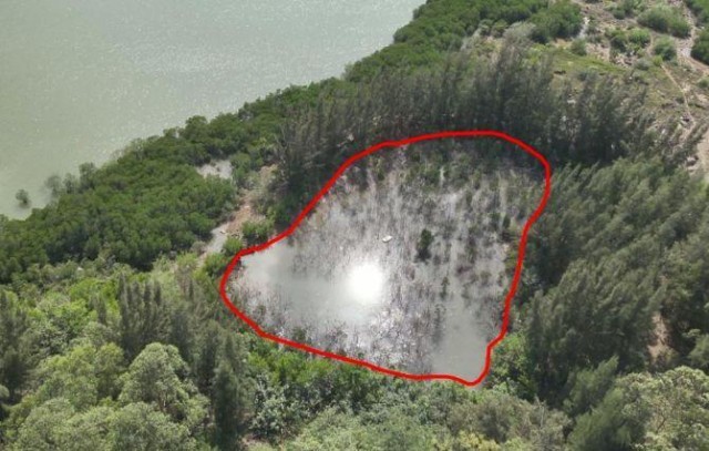 2023年11月23日,督察组现场督察使用无人机拍摄,临高县彩桥红树林自然保护区内900余株红树林枯死