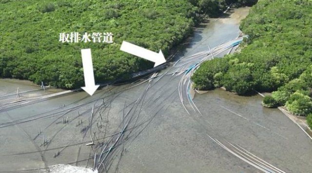 2023年11月22日,督察组现场督察使用无人机拍摄,养殖塘取排水设施穿越清澜红树林省级自然保护区核心区