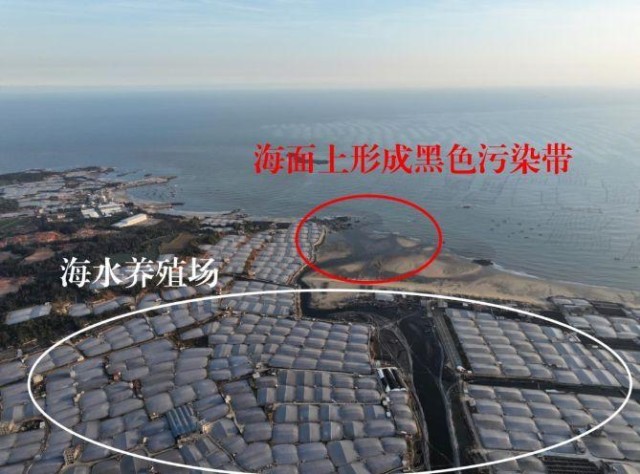 2023年11月26日,督察组现场督察使用无人机拍摄,漳浦县将军湾沿岸密集分布提水式海水养殖场,大量养殖尾水通过溪流直排入海,在海面上形成黑色污染带