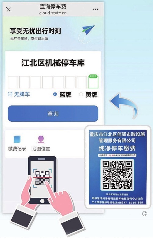 图②:重庆“纯净版”停车缴费二维码及扫码显示图。