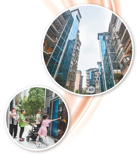 图①:四川广安近年积极推进老旧小区电梯加装工作。图为当地一小区内,各楼幢加装的电梯已投入使用。