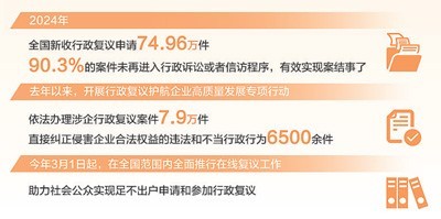 什么叫发挥“主渠道作用”?一组数据很能说明问题:2024年,全国新收的行政复议申请接近75万件,超九成的案件化解在行政复议程序中,没有再进入行政诉讼或者信访程序。作为行政系统内部纠错的监督制度和解决“民告官”行政争议的救济制度,其具有公正高效、便民为民的制度优势,是推进法治政府建设的重要抓手。