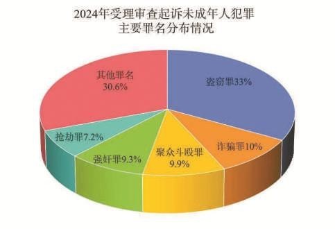 (2)办理未成年人犯罪案件类型相对集中。2024年,全国检察机关受理审查起诉未成年人犯罪人数较多的罪名包括:盗窃罪33519人、诈骗罪10166人、聚众斗殴罪10054人、强奸罪9457人、抢劫罪7356人,五类犯罪人数合计占受理审查起诉未成年人犯罪总数的69.4%。