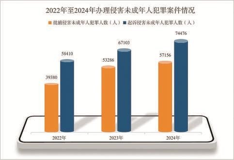 (1)办理侵害未成年人犯罪案件增幅放缓。2024年,全国检察机关共批准逮捕侵害未成年人犯罪57156人,提起公诉74476人,同比分别上升7.3%、11%,增幅较2023年分别下降28个、3.9个百分点。