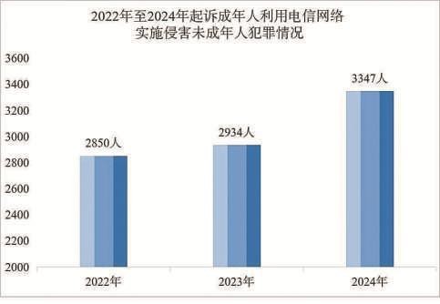 (3)成年人利用电信网络侵害未成年人犯罪上升较快。2024年,全国检察机关起诉成年人利用电信网络实施侵害未成年人犯罪3347人,同比上升14.1%,在成年人侵害未成年人犯罪中的占比从2023年的6.9%上升至2024年的7.3%。