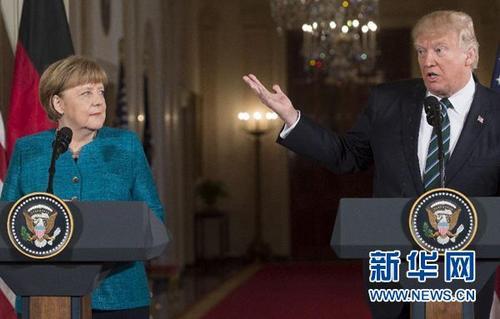 在美国华盛顿,美国总统特朗普(右)与德国总理默克尔举行联合新闻发布会。图片来源:新华网