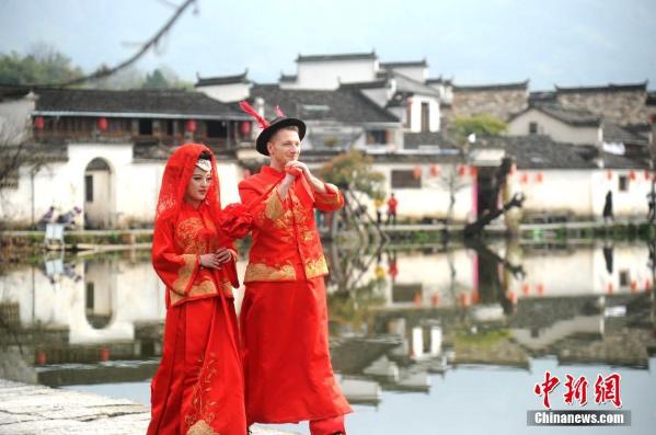 3月25日,乌克兰“新郎”牵着中国“新娘”给游客行礼。当日,在安徽省黄山市黟县宏村风景区上演了一场中西合璧“民俗婚嫁”演出,充满徽州古典元素的婚礼吸引众多游客围观。 中新社记者 张娅子 摄