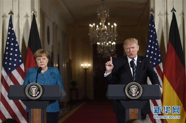 3月17日,在美国华盛顿,美国总统特朗普(右)与德国总理默克尔举行联合新闻发布会。新华社/法新
