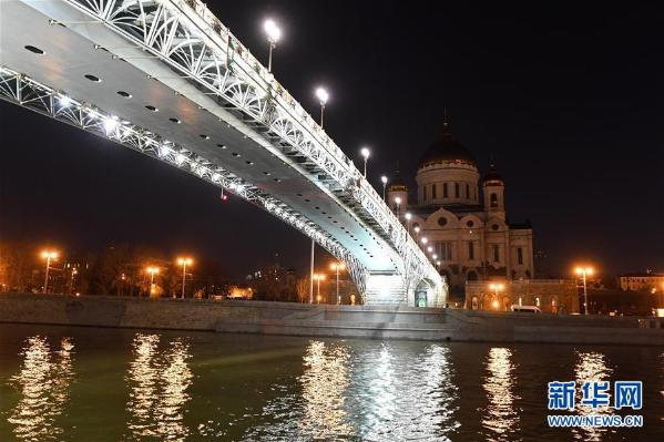 这是3月25日在俄罗斯莫斯科市拍摄的救世主大教堂响应“地球一小时”活动熄灯。 新华社/卫星社