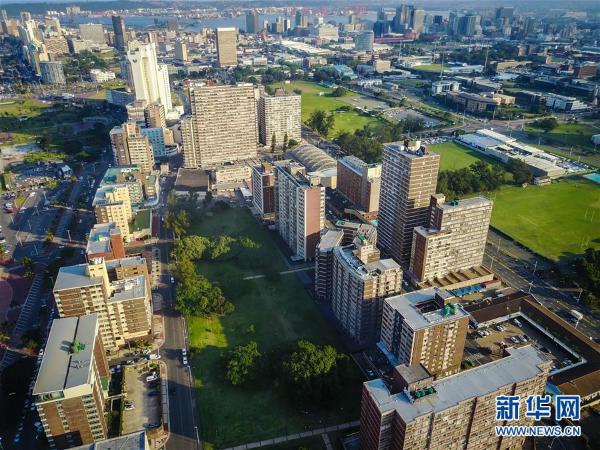 这是5月4日用无人机航拍的南非德班城市一景。德班位于南非东部的夸祖鲁-纳塔尔省,濒临印度洋,是南非最大的港口城市。因其美丽的海景和温暖的气候,德班也是世界著名的旅游城市。新华社记者 翟健岚摄