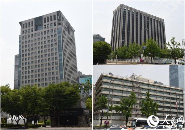 世宗大路云集了韩国核心政府部门及重要外交公馆。韩国总统府青瓦台就位于光化门后方不远处,光化门前的世宗大路两旁则坐落着韩国政府综合办公大楼(相当于中国国务院)(右上)、外交部办公大楼(左一),以及美国大使馆(右下)。