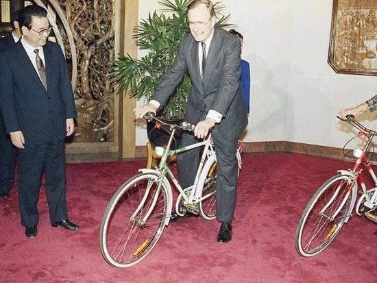 李鹏送给老布什夫妇两辆“飞鸽牌”自行车,这位当年喜欢和夫人芭芭拉在北京街头骑车的美国总统兴致勃勃地跨上车子,在众多记者面前摆出骑行的姿势。 老布什在这次出访期间接受了中央电视台的采访,成为首位在中国荧屏上向中国人发表谈话的美国总统。
