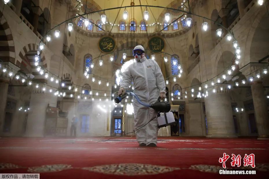 当地时间3月11日,土耳其伊斯坦布尔,一名穿着防护服的市政工人对Kilic Ali Pasa 清真寺进行消毒。