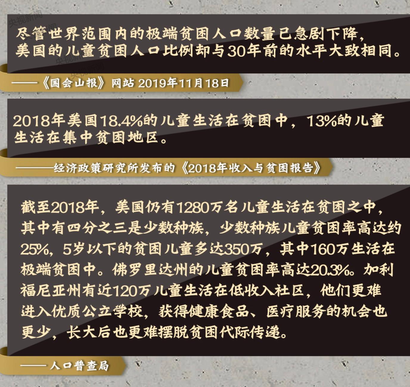 儿童贫困问题依然形势严峻。美国的儿童贫困人口占比与结构迄今存在着令人揪心的现状,作为世界头号强国,无疑充满着反讽意味。而多项调查数据表明,该种情况恐将持续存在,惨淡的现实叠加新冠病毒的爆发式蔓延,贫困儿童群体的疫情防控形势不容乐观。