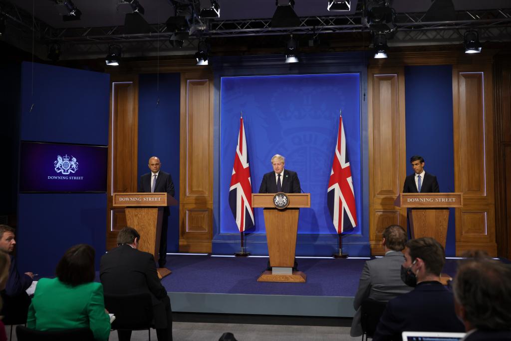 2021年9月7日,英国首相约翰逊(中)和时任卫生大臣贾维德(左)、时任财政大臣苏纳克在伦敦出席新闻发布会。(新华社发,英国首相府供图)