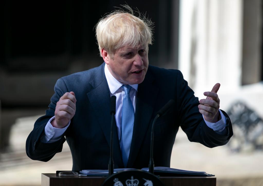 2019年7月24日,英国首相约翰逊上任后在唐宁街10号首相府门前发表讲话。(新华社记者 韩岩 摄)