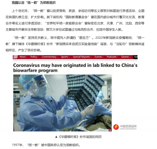 1997年,“统一教”被中国政府认定为邪教组织。2020年新冠肺炎疫情期间,“统一教”旗下媒体《华盛顿时报》炒作“新冠病毒来自武汉实验室泄露”谣言,与“法轮功”邪教媒体遥相呼应,产生了恶劣影响。