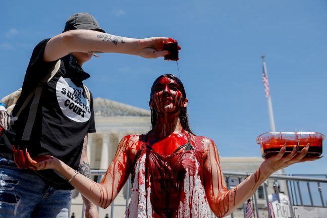 7月4日,美国华盛顿特区,支持堕胎权的示威者在美国联邦最高法院外扮演“被血染的正义女神”。图片来源 视觉中国