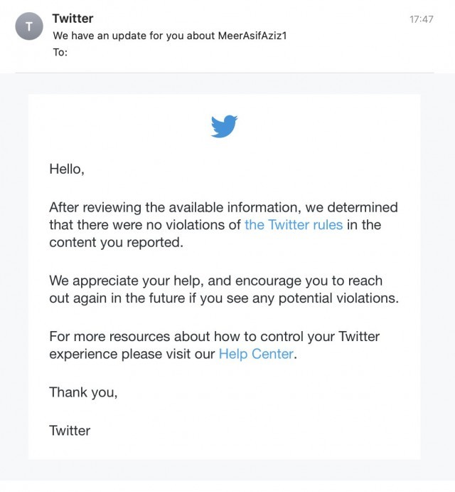 来自推特的电子邮件写道:“在审查了可用信息后,我们确定您报告的内容中没有违反推特规则。我们感谢您的帮助,如果您发现任何潜在的违规行为,我们鼓励您在未来再次与我们联系。”
