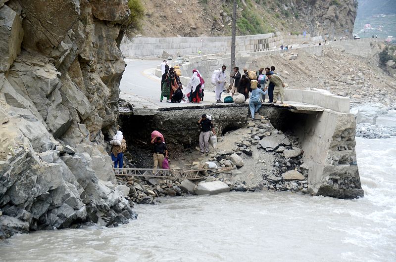9月5日,巴基斯坦开伯尔-普赫图赫瓦省斯瓦特县,洪水摧毁了桥梁和道路,人们背着食物撤离。图片来源 视觉中国