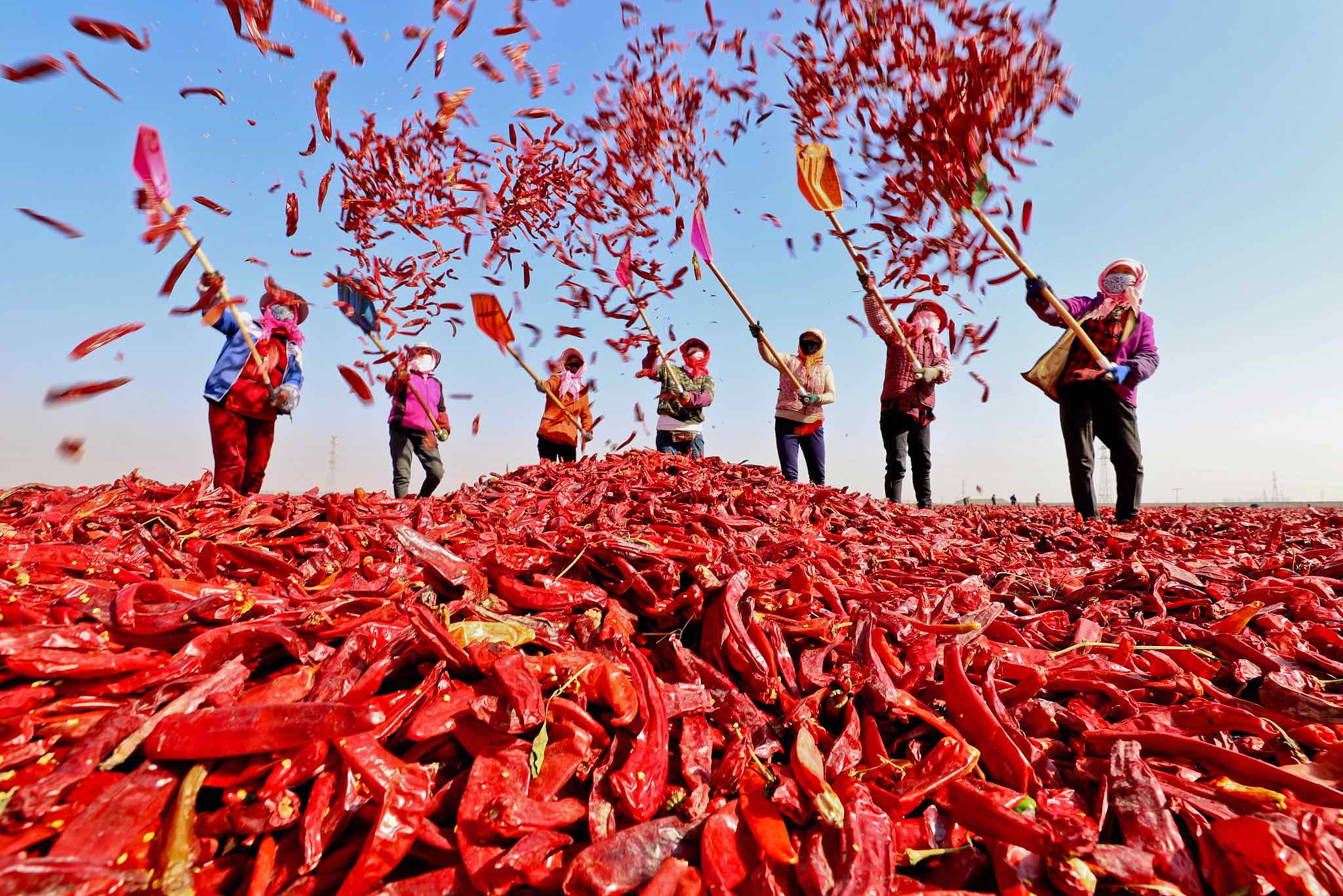 10月26日,中国甘肃省张掖市,甘州区乌江镇敬业村红辣椒晾晒场上,农户们正在忙碌。