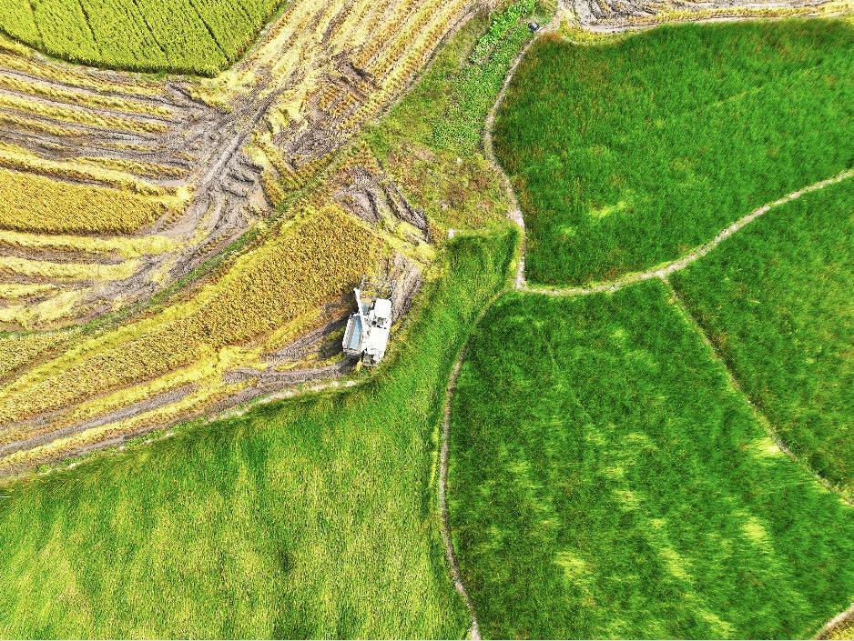 10月27日,中国广西壮族自治区桂林市,荔浦市修仁镇,农民在田间收割水稻。一旁的绿色田地中种植的作物是马蹄。