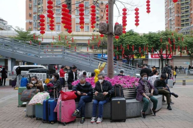 1月8日,旅客在深圳福田口岸附近休息。陈楚红/摄